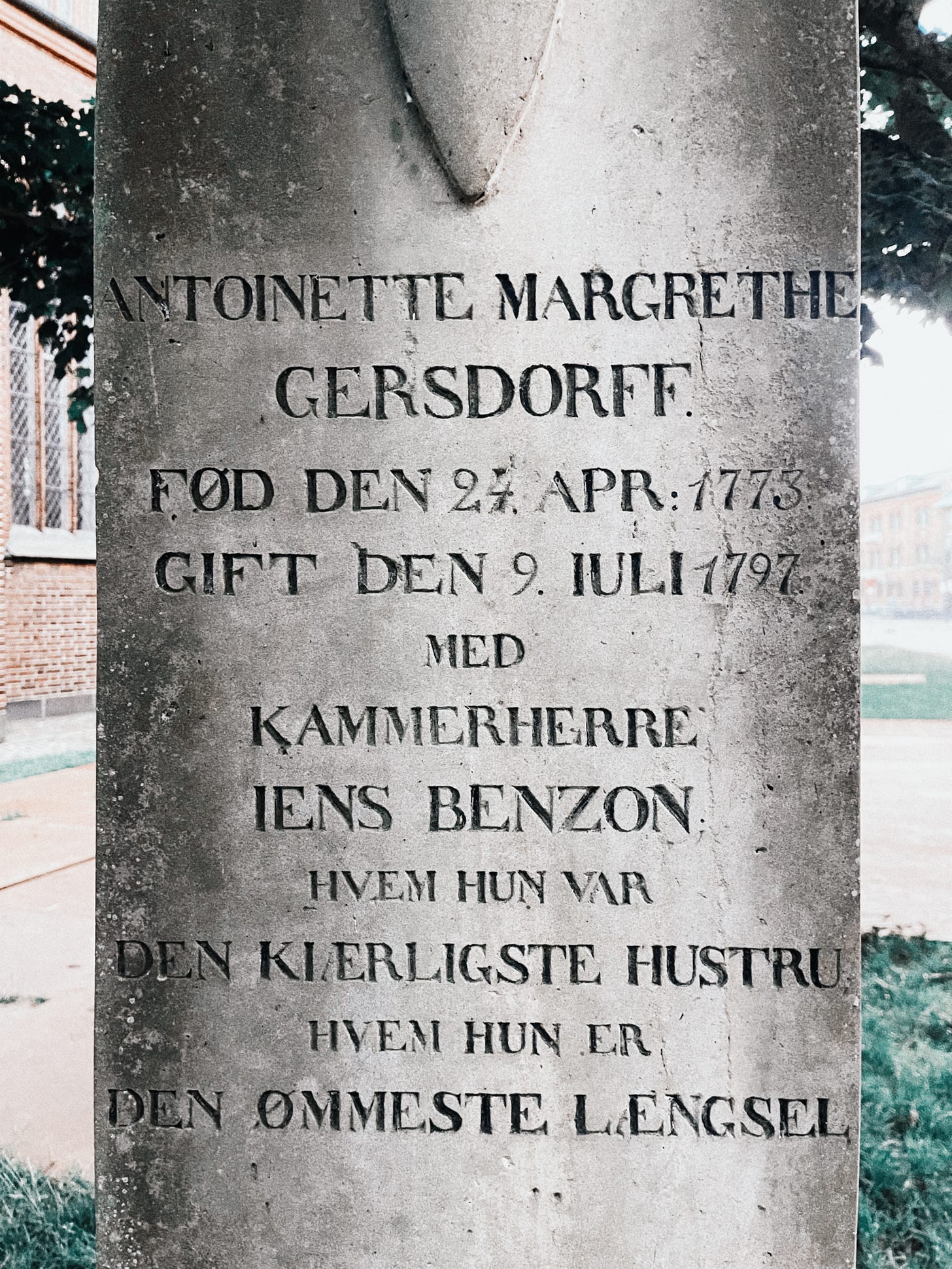 Og den og det uafrystelige savn kan ikke beskrives meget bedre, og sådan står gravstenen for Jens Benzon og hans elskede hustru Antoinette Margrethe Gersdorff. Her, i det stille hjørne af den gamle kirkegård, vidner stenen ikke blot om to menneskers liv, men om en kærlighed, der stadig taler til dem, der standser op og lytter.